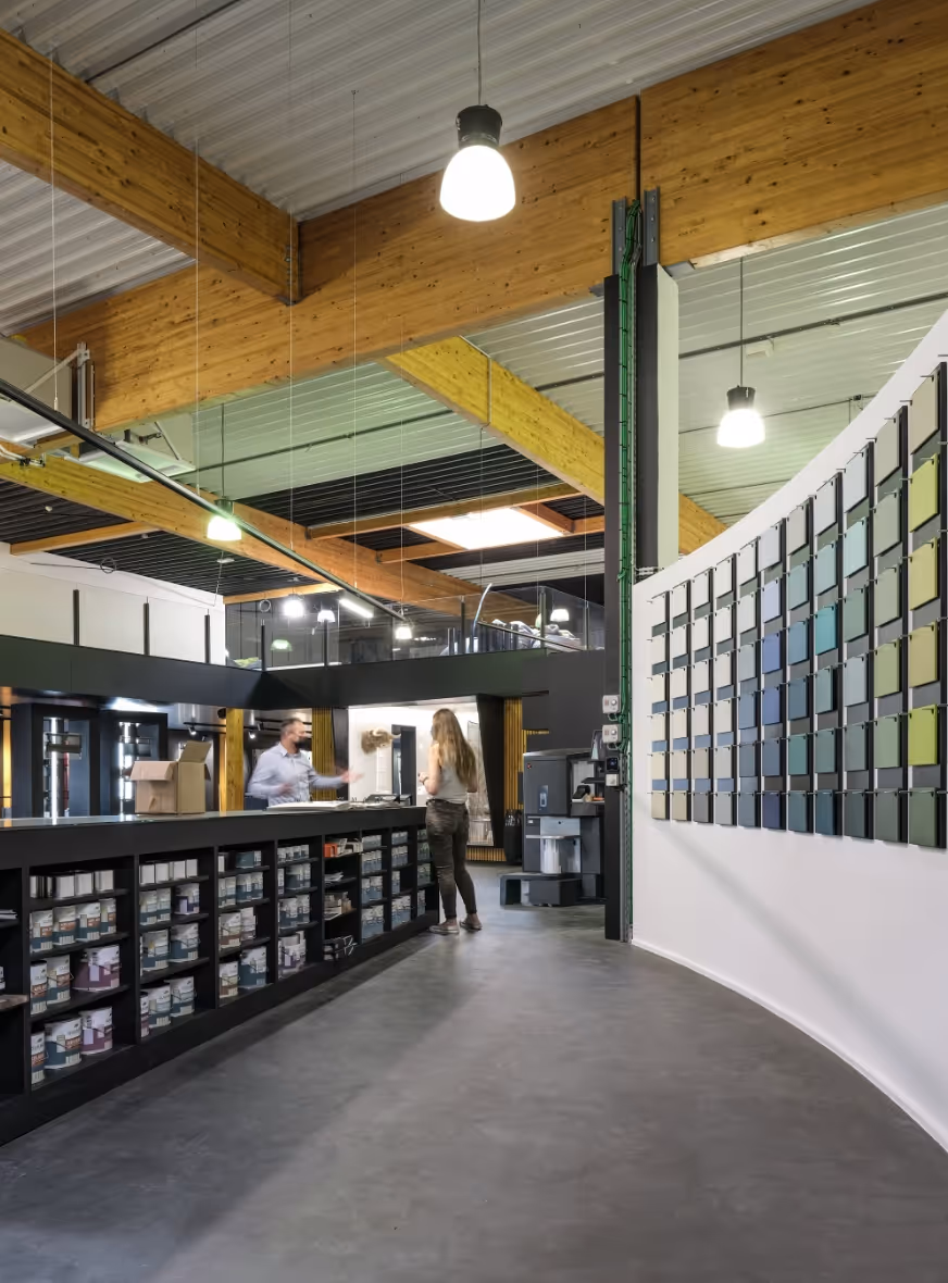For this paint store in Marche-en-Famenne, Atelier Matière created the micro-concrete floor and designed a metal counter for the professional space.