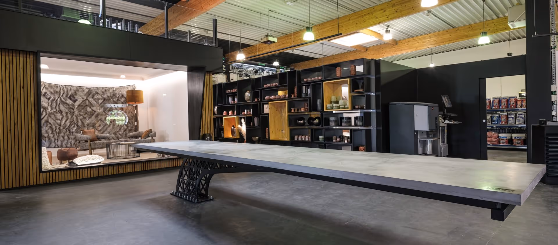 We also designed the staircase, the storage for the paintings, an industrial table made of metal and micro-concrete, as well as an S-shaped counter in the same tailor-made and artisanal spirit.