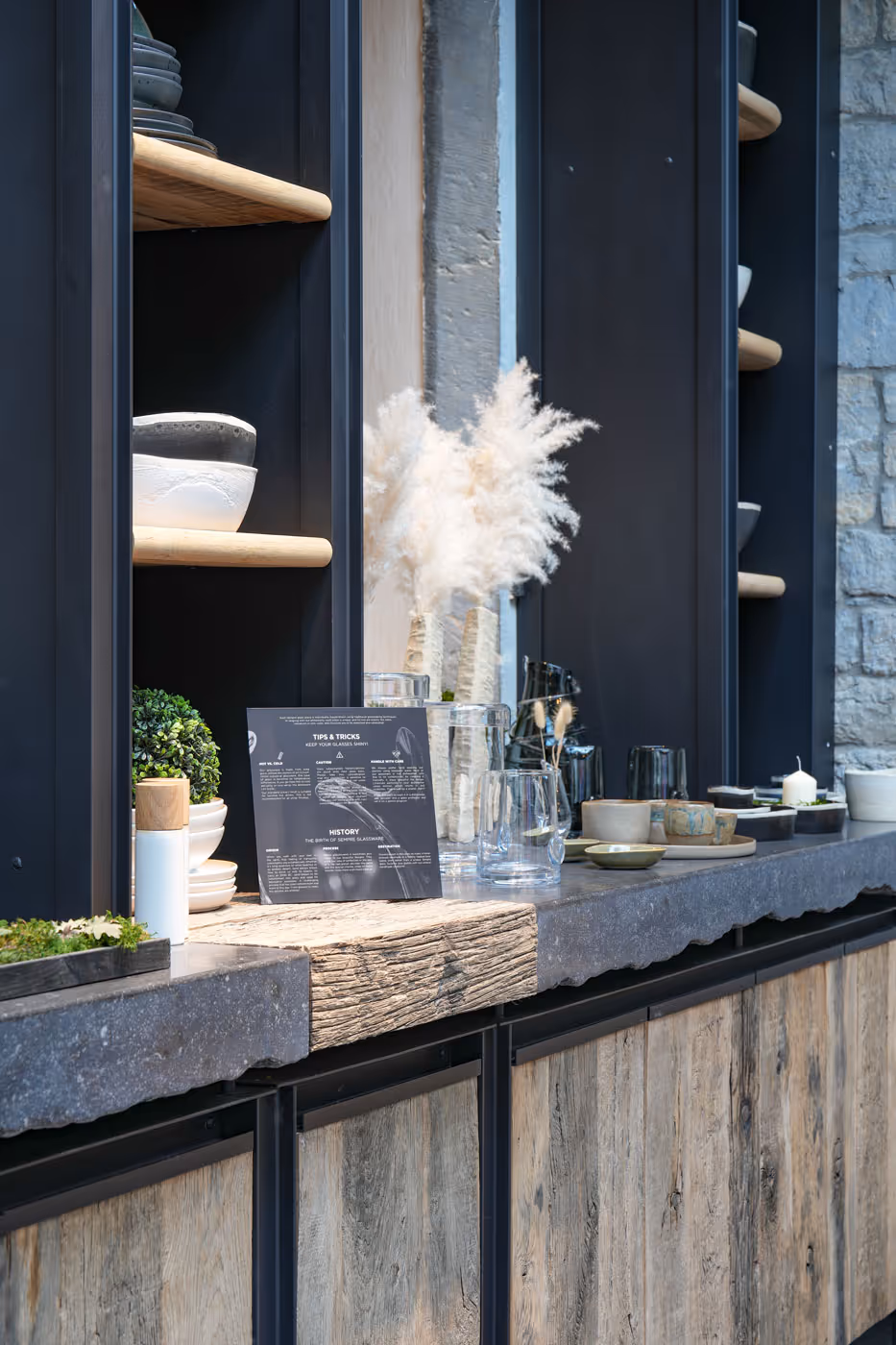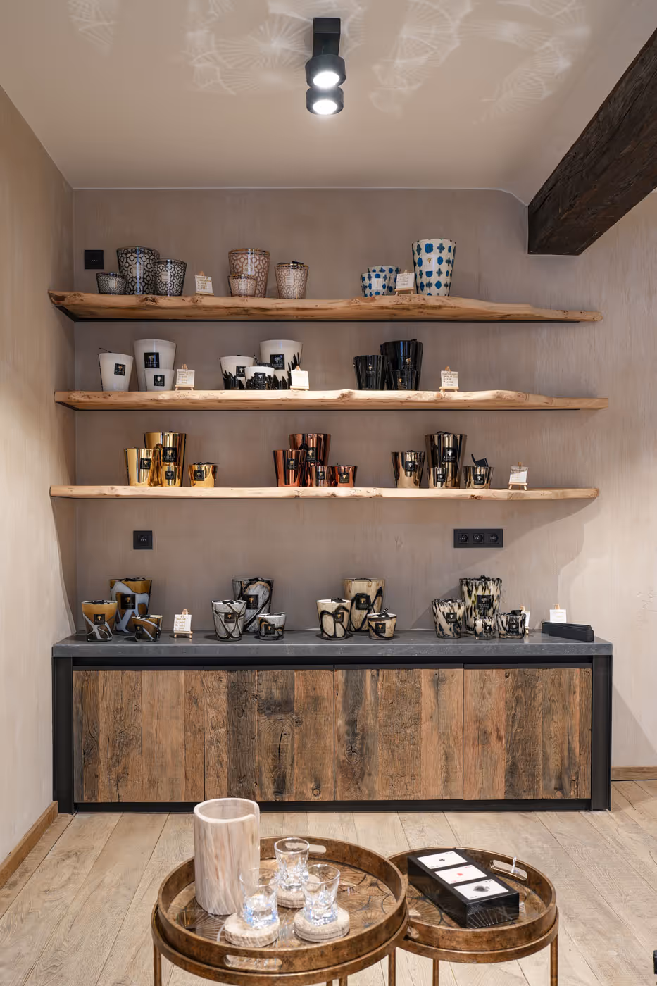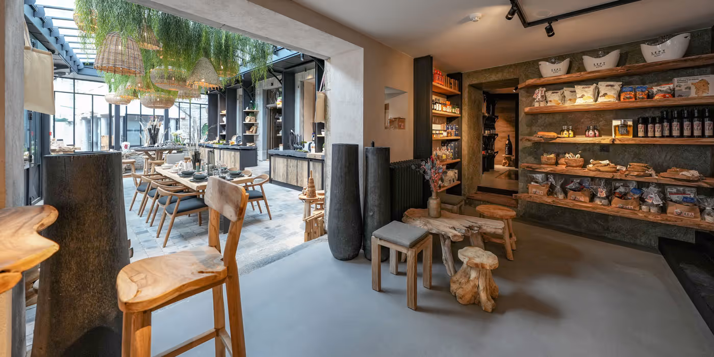 For this store in Durbuy, the work of Atelier Matière concerns the creation of the metal canopy as well as the installation of oak parquet and the micro-concrete floor. For the layout and the exhibition, Atelier Matière designed the tailor-made furniture, including the counter, the shelves, the buffet, and the wine cellar module. A project where painted metal, oak, stone and micro-concrete meet, in a balance between authenticity and design.