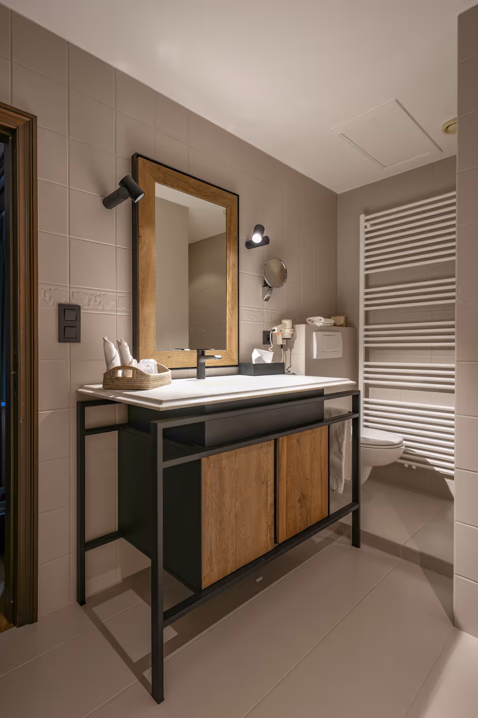 Les salles de bain ont également bénéficié d’un travail soigné, avec la rénovation du meuble vasque et des finitions en parfaite harmonie avec l’esprit du lieu.