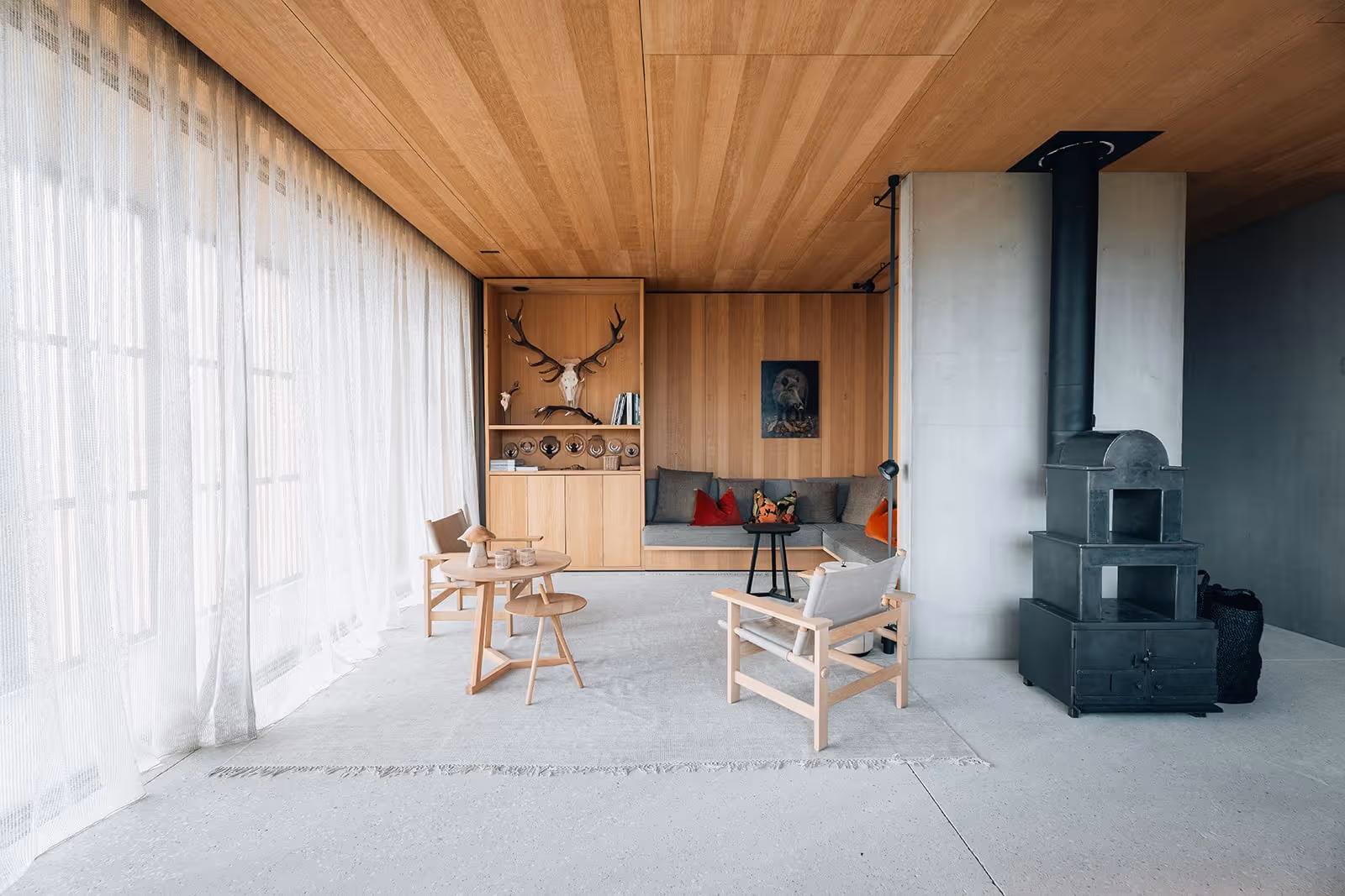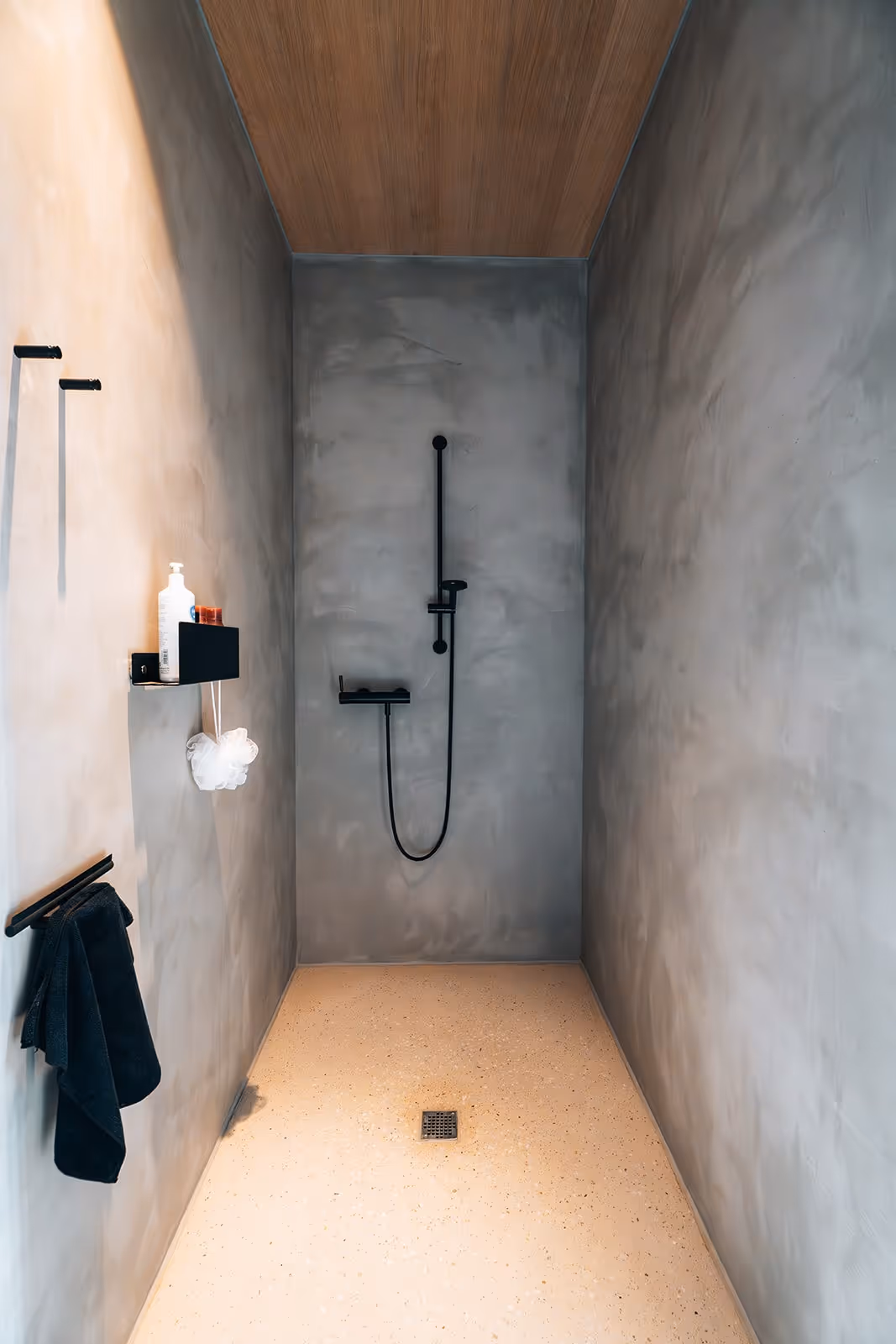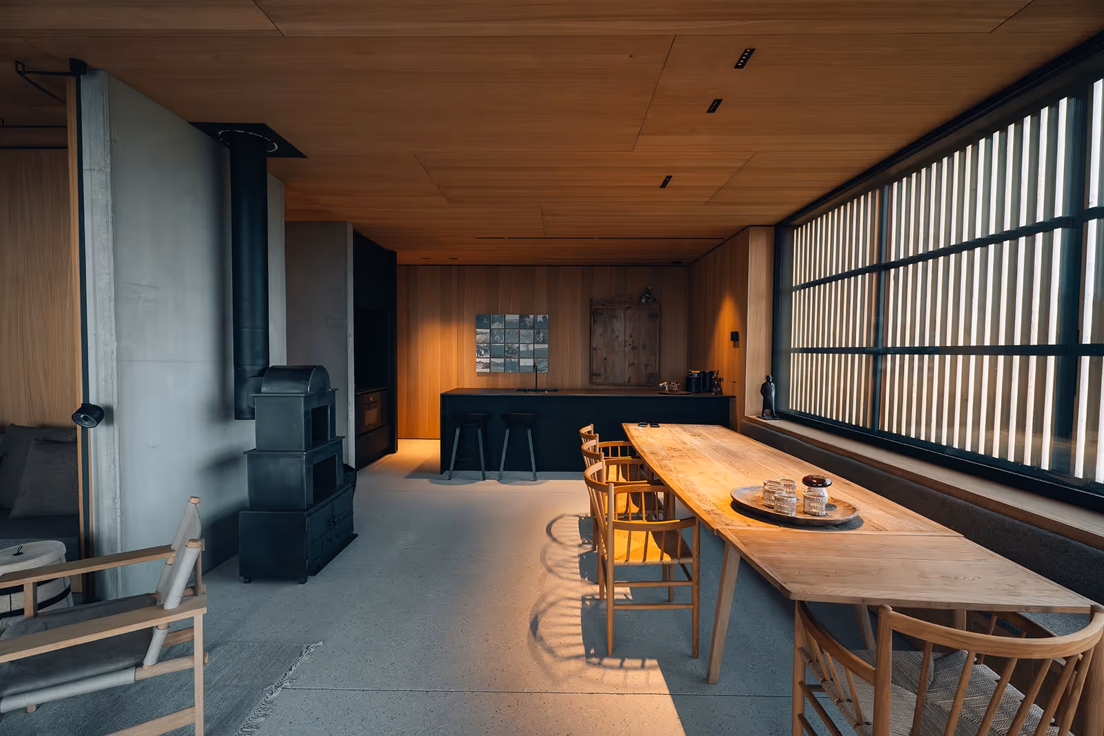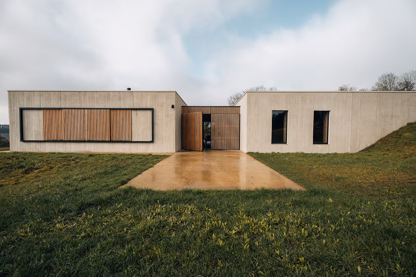 À l’extérieur : réalisation du sol en micro-béton, des grandes portes et des volets sur mesure, dans une continuité esthétique et matérielle avec l’intérieur.