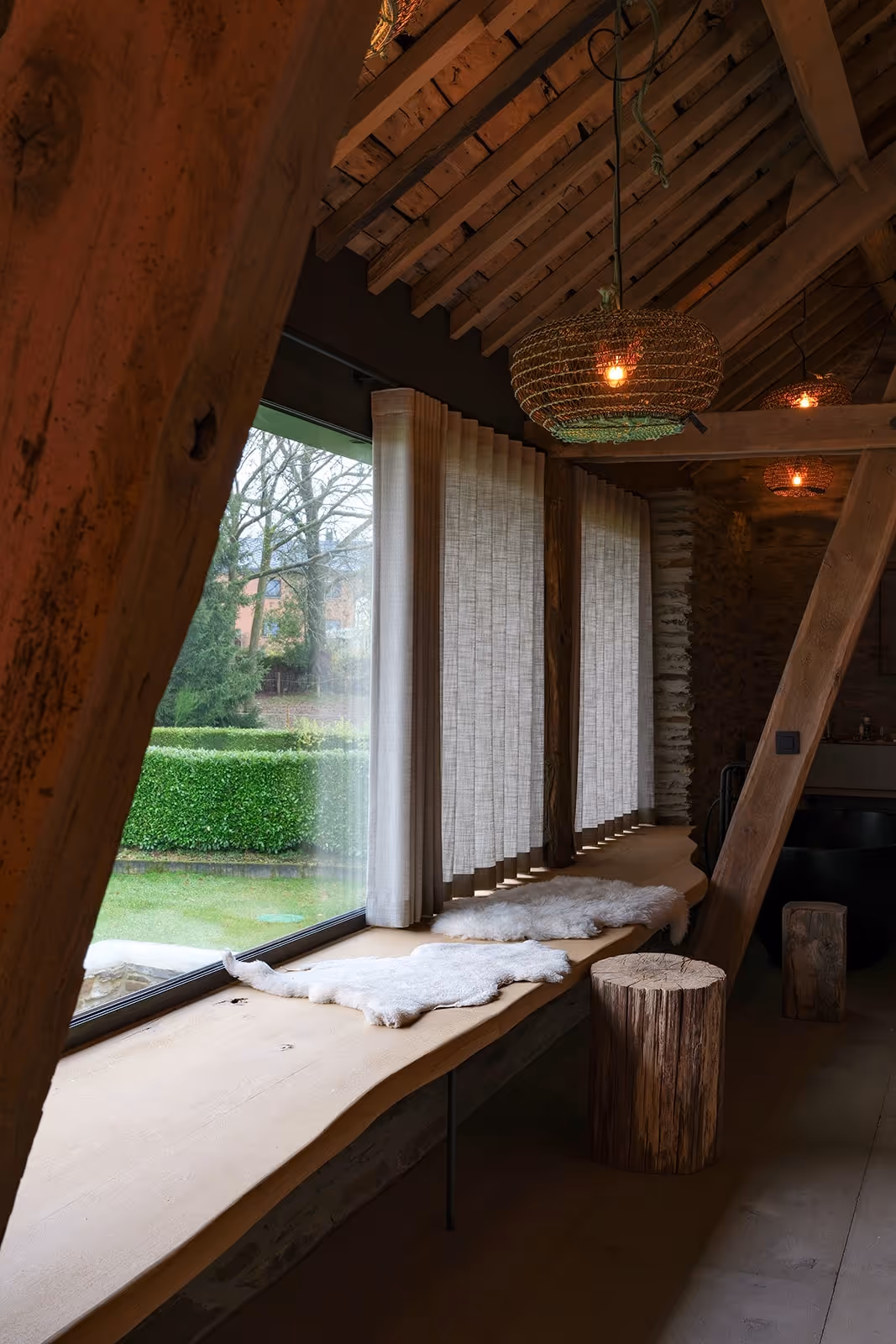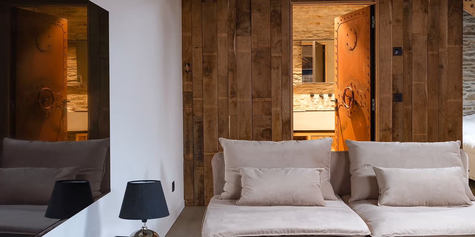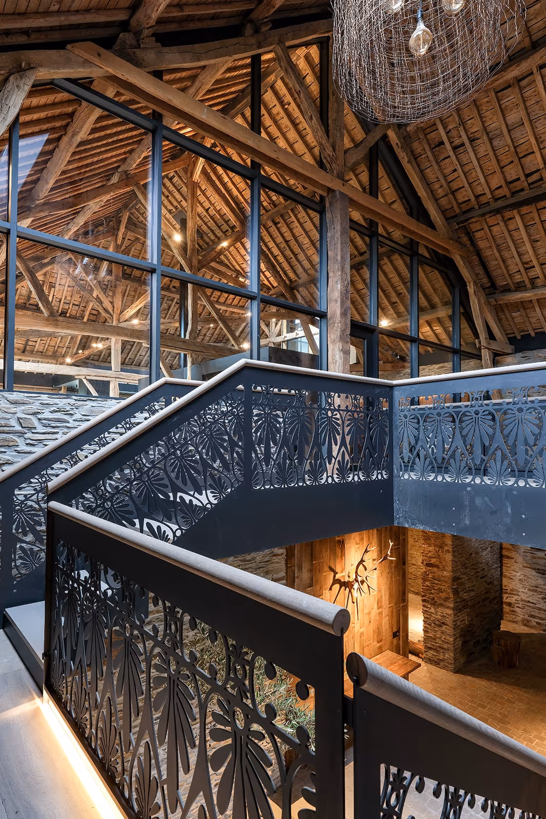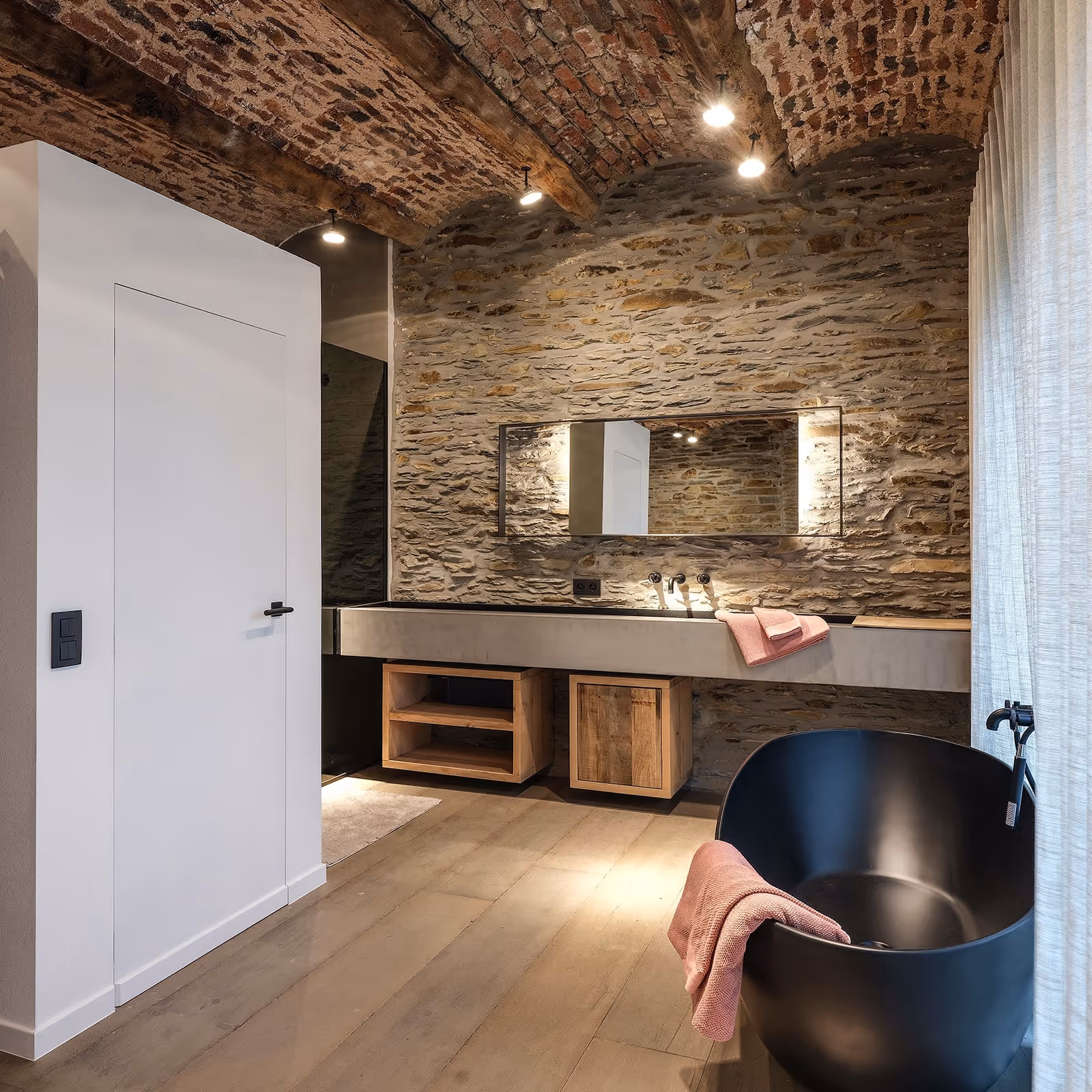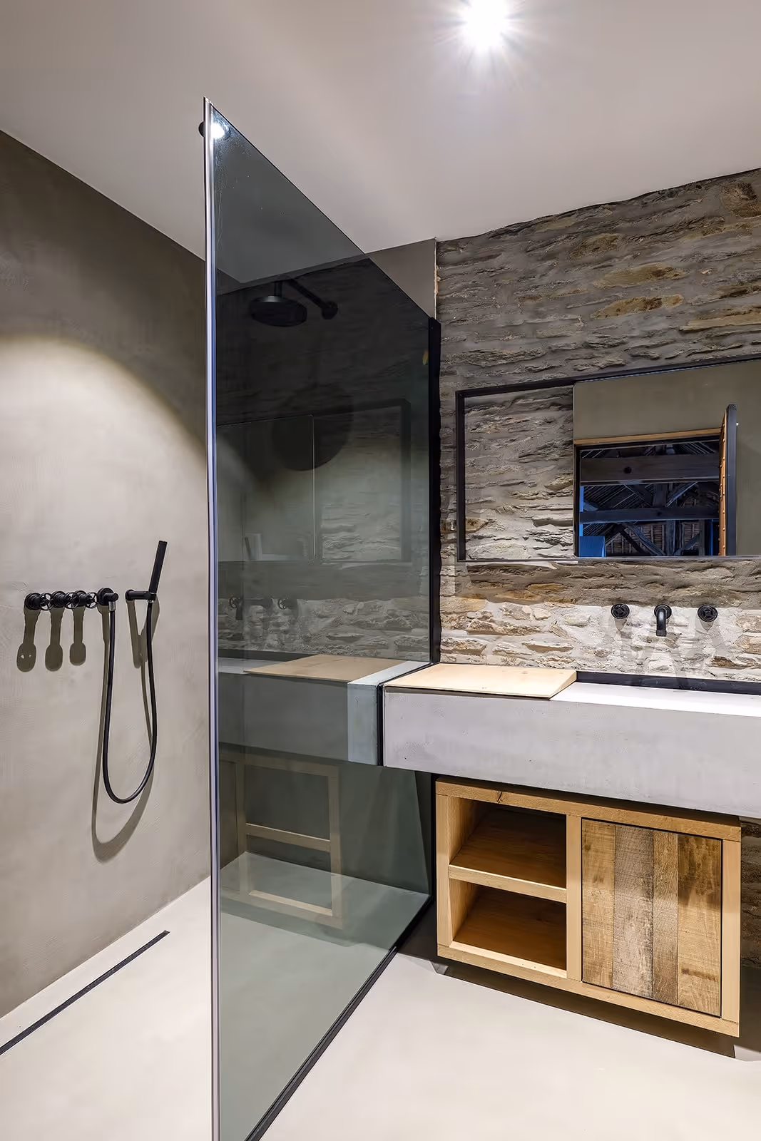 La salle de bain a été réalisée avec un meuble évier en micro-béton, accompagné de son miroir et d’un évier en béton. Notre équipe a également fabriqué la banquette, la tête de lit, la porte de salle de bain en métal rouillé, les tablettes des chambres et la table principale. Un mur habillé en bois et le socle de l’escalier complètent cet ensemble, où les matières brutes et le savoir-faire artisanal s’expriment avec élégance.